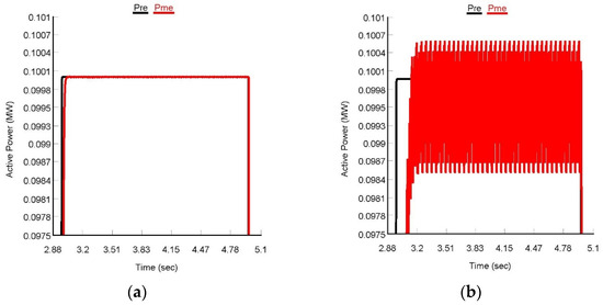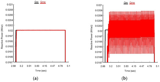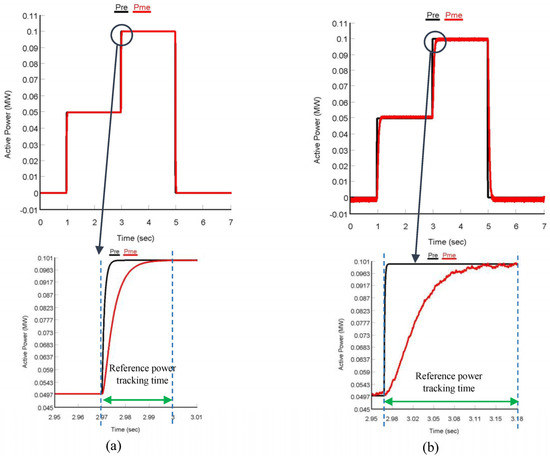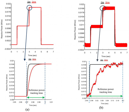 The results obtained for both the controllers tracking performance analysis are depicted in Figure 7 and Figure 8. To test the tracking performance of the controller’s real power, references were varied between 0 MW and 0.1 MW (PV output is non-linear), whereas reactive power references were changed between 0 MVar and 0.02 MVar, respectively.