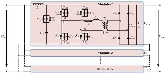 As the core of the IPOS cascaded DC/DC converter, the operating characteristics of the power module directly determine the performance of the DC/DC converter [17]. At the same time, the inconsistency of hardware parameters between power modules will cause the imbalance of input current and output voltage between modules in the DC/DC converter, which will seriously affect the reliable operation of the converter [18]. Therefore, it is necessary to select the appropriate power module topology of DC/DC converter for PV HVDC collection and grid-connection. Meanwhile, the input current or output voltage equalization between modules needs to be controlled to ensure the stable operation of power modules and the converter. In [19], a modular cascaded DC converter is proposed, and the power module uses two-stage power conversion topology, which requires many components and complex coordination control between the two stages. In [20], an IPOS DC/DC converter is proposed based on dual active bridge (DAB) topology, but both sides of the converter adopt active power devices, so the control is relatively complex [20]. Literature [21,22] studies the voltage and current sharing control strategy of the IPOS cascaded DC/DC converter, but these are all realized based on the voltage and current equalization command sent by the centralized controller. Once the number of operating modules changes, the equalization command needs to be adjusted in time according to the actual number of operating modules. If the converter fails to obtain module fault information in time, the incorrect equalization command will be generated, and the converter will not operate normally.