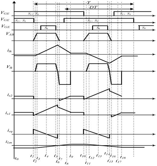 Soft switching analysis considering the excitation inductance of the transformer and switch junction capacitance is illustrated as follows. The operation mode timing sequence is shown in Figure 5, and it contains eighteen operation modes in the half switching period.