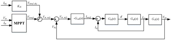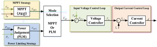 In PV HVDC collection and grid-connection application occasion, the DC/DC converter mainly realizes the maximum power point tracking (MPPT) function of PV array. The basic control strategy of the converter is to calculate the input voltage reference command through the MPPT algorithm according to the output voltage and current of the PV array, and then realize the double closed-loop control by the input voltage closed-loop and output current closed-loop. The grid-connected power can be controlled by controlling the output grid-connected current of the DC/DC converter. In addition, the converter needs to have the function of response the power dispatching command of the PV power plant. When receiving the power dispatching command of the PV power plant, the PV DC/DC converter must control its output power according to the power dispatching command and the current real-time output power. When the PV power plant receives the power grid power limiting dispatching command, if the current output power of the converter is less than the power limiting dispatching command value, the DC/DC converter will operate in the maximum power point tracking mode according to the current actual output power. If the current output power of the converter is greater than the power limiting dispatching command value, the converter will operate according to the power limiting command and, deviating from the maximum power point tracking mode, execute the power limiting operation mode. The basic control strategy of PV DC/DC converter is shown in Figure 6.
