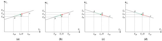The input voltage command of the module has a linear relationship with the input current, and the input voltage command directly reflects the balance of the input current, since the input voltage of each module is the same, the input current is basically the same after stabilization. By introducing the output voltage as the equalization command into the input voltage command, the relationship between the module input voltage and the output voltage can be derived, as shown in Figure 8b. Similarly, the relationship between module output current, input current and output voltage can be deduced, as shown in Figure 8c,d.