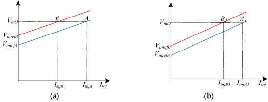 Taking Figure 8a as an example, the working process of the distributed equalization control strategy is analyzed. Point O in the Figure is the average input current Iin/N. When the module operates at point A, the input current is IinjA. At this time, through increasing the input voltage command of the power module, the output current of the module decreases, and then the input current of the module decreases, and the module working point moves to point O. When the module operates at point B, the input current IinjB of the module is lower than the average current. At this time, through reducing the voltage command of the module, the module output current increases, the input current also increases, and the module operating point moves to point O. According to the characteristics of module input voltage and current, as well as the input parallel and output series connection relationship between modules, the module input current corresponds to the unique input voltage. Therefore, the distributed input current sharing control can be realized by adjusting the input voltage.