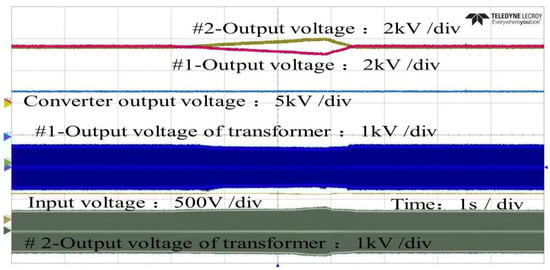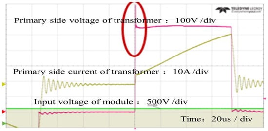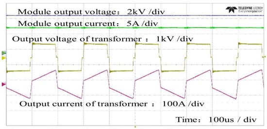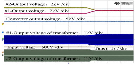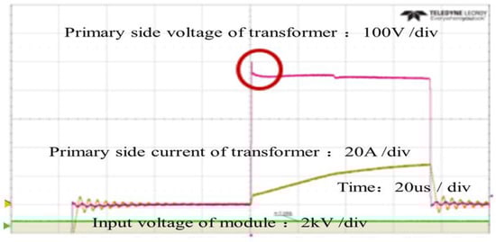 Figure 28 shows the transient voltage and current waveforms of the ±30 kV/1 MW DC/DC converter during the pre-charging process. Although a 2 kΩ/(30 kW) soft startup resistor is configured at the output side of the converter, the transient current during pre-charging process is still large up to 37.5 A. After pre-charging, the output current of the DC/DC converter is decreases to zero, and then the DC/DC converter can be started up and unlocked.