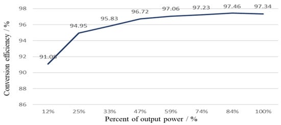 Figure 18 is the conversion efficiency curve of the proposed converter. It can be seen that the conversion efficiency of the power module can reach more than 91% at 20% output power, and more than 96% at 50% output power. The maximum conversion efficiency of the converter can reach 97.46% at 80% output power. In summary, the power module has a high efficiency in a wide input voltage range and the whole output power range.