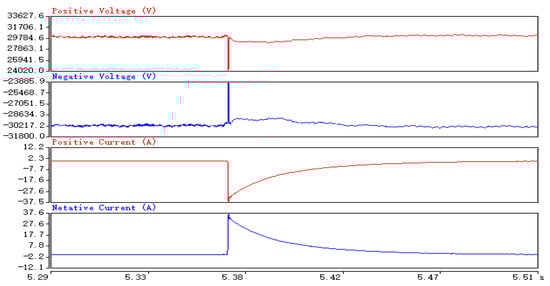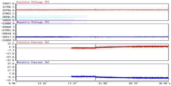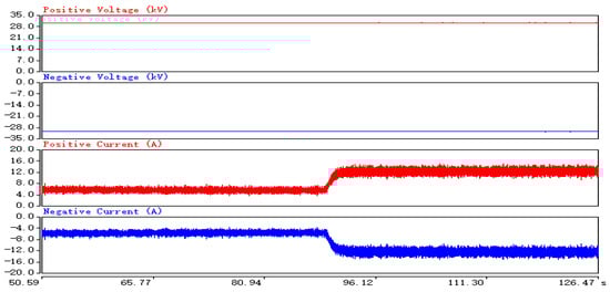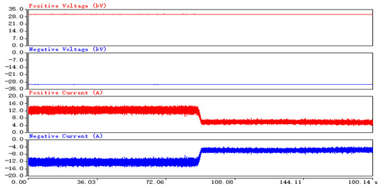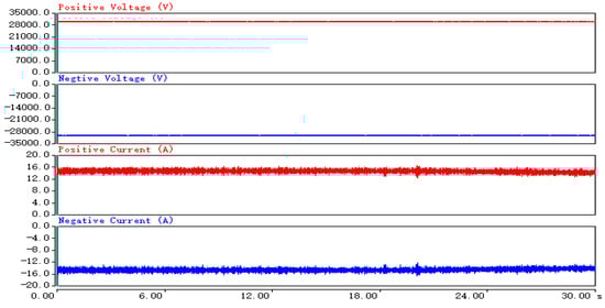 Figure 30 shows the voltage and current steady-state waveform of the ±30 kV/1 MW DC/DC converter. The DC/DC converter operates at the maximum power tracking mode, the output voltage and current are ±30 kV and 15 A, respectively, and the output power of the converter reaches 900 kW, which is close to the normal output current and the output power.