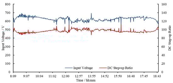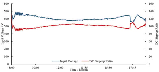 Input voltage and DC step-up ratio of the DC/DC converter on a sunny day.