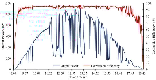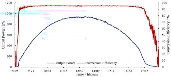 Output power and conversion efficiency of the DC/DC converter on a sunny day.