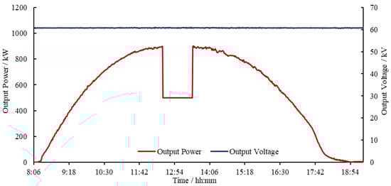 Figure 37 shows the output power and output voltage of the DC/DC converter with power limiting control strategy on a typical sunny day. The output voltage of the converter is controlled by the HVDC grid at 60 kV. At the time of 12:30, the DC/DC converter receives the power limiting command from the PV power plant controlling system. The operation mode of the DC/DC converter switches from MPPT mode to power limiting mode, and the output power is limited at 500 kW. At the time of 13:30, the power limiting command is released and the DC/DC converter switches from power limiting mode to MPPT mode, and all PV power is output.