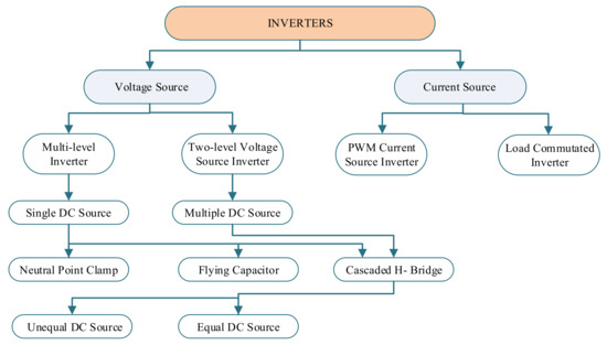 To increase efficiency, the total harmonic distortion (THD) of the inverter must be decreased. The square-wave output contains an infinite number of harmonics, and to reduce this, we must make multilevel level output that is close to the sinusoidal waveform with reduced harmonics in the output voltage. Multilevel inverters can be of the 2n + 1 type, where n is an integer [4]. A multilevel inverter requires more switches, increasing the possibility of switching failure, and therefore, the unbalanced output voltage is obtained, causing increased THD in the output voltage. Inverters, based on the source, are of two types [1]: (1) the current source type and (2) the voltage source inverter. Based on the source type, a multilevel inverter is further classified as (1) a single DC source or (2) a multiple DC source. In a single DC source multilevel inverter, there are two types: the first is asymmetric, meaning the DC sources’ voltage across the terminal is equal, and the second is asymmetrical, meaning the voltage across the terminal is unequal. The above classification of the inverter is provided in Figure 1.