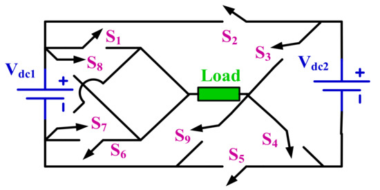 The proposed topology in this paper consists of nine active switches and two isolated DC sources, where the second source is fixed at half of the first DC source as shown in Figure 2. Switches S7, S8, and S9 are added to this circuit to provide more redundant paths for each output voltage level. As the number of redundant paths increases, the circuit has additional paths to obtain the required voltage if there is a fault in any switch of the circuit. The proposed five-level topology counters the drawback of experiencing a complete shutdown during the failure (OC) in switches S1 and S4. The output voltage level reduces to three-level during the failure in switches S2 and S3. The switching table of the proposed topology is provided in Table 2. Table 3 shows the potential switching states and viable output voltage levels if any switch from S1 to S9 fails (OC fault), taking one switch faulty at a time. As an example, if switch S1 fails, all of the five levels can be synthesized using one of the modes for each level from δ2, δ3, δ4, δ5, δ8, δ9, δ12, δ13, δ14, δ15, δ16, δ17, δ18, δ19, and δ20, as shown in Figure 3.