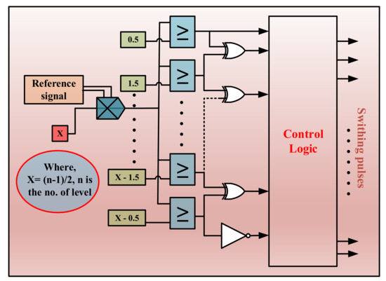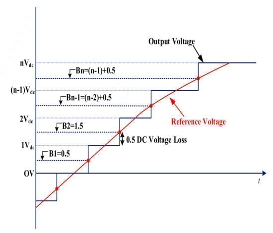 Modulation techniques play a crucial role in affecting switching loss, harmonics, and filter size. Conventional modulation methods have higher complexity, high switching loss, and increased switching harmonics as the number of submodules increases. The NLC has the advantage of low switching losses and minimum low order harmonics for higher output voltage applications. In the conventional NLC technique, a sinusoidal signal is used as a reference (Vref) signal, as shown in Figure 4 [10], which is compared with other carrier signals (B1 to Bn). The conventional procedure is presented in [11]. In this, 0.5Vdc DC loss error is always maintained between two levels. The working principle is depicted in Figure 5.