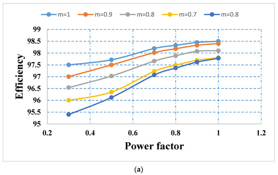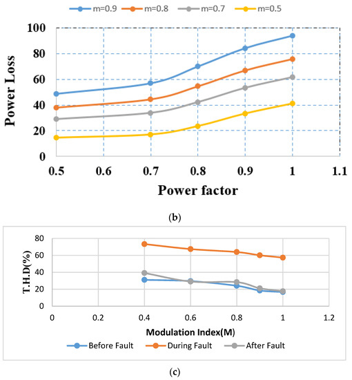 The losses due to the internal resistance of each semiconductor component are used to calculate the losses that occur due to them. Results are obtained for the resistive load by using the PLECS software. Figure 7a shows the efficiency versus power factor curve from which we observe that efficiency will be at a maximum when the modulation index equals one, and efficiency will decrease as the modulation index decreases. Figure 7b shows the power loss vs. power factor curve as we observe that power loss will be more for modulation index equals one and continues decreasing as we decrease the modulation index. Figure 7c shows the variation of THD with a change in the modulation.