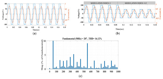 The output voltage, load current, and THD for the (RL) load during the normal condition are simulated in the modified FT-MLI, as well as the output voltage and load current for the fault in each switch. The simulation is carried out using MATLAB/Simulink. Table 4 lists all of the device parameters used in the simulation. The magnitude of the DC voltage sources for simulation purposes was considered to be 100 and 50 volts. The output voltage and current, as shown in Figure 8a, are obtained at Z = 100 Ω + 318 mH during the normal condition, and the number of output voltage levels was reduced to three, as shown in Figure 8b when the modulation index changed from 1 to 0.5. This shows that the number of voltage levels is dependent on the modulation index. The THD of the output voltage at 50Hz is 16.12%, which is shown in Figure 8c.
