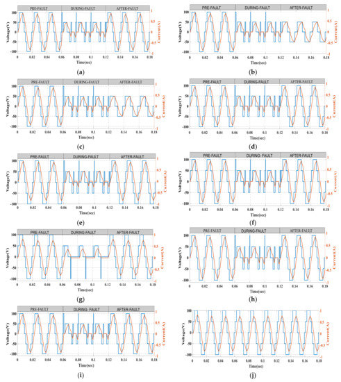 (a) Fault in Switch S1/S1 S4, (b) fault in switch S2, (c) fault in switch S3, (d) fault in switch S4, (e) fault in switch S5, (f) fault in switch S6, (g) fault in switch S7/S1 S7, (h) fault in switch S8/S1 S8, (i) fault in switch S9/S1 S9, and (j) output of PUC5 result in normal condition.