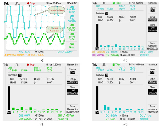 A hardware setup has been designed to test the feasibility and resilience of the proposed FT topology. An experimental model testing setup is shown in Figure 10. Through the gate driver TLP250 (F) and a DSP real-time controller that works as an interface with MATLAB/Simulink, control signals are provided to operate the IGBTs (IGBTFGA25N120) of discrete power switching modules. Two DC sources of 120 and 60 volts, respectively, are used in the hardware setup to obtain the result at a load of R = 300 Ω. Figure 11a shows the output voltage and current during normal conditions with a step size of 40 V and a peak output voltage of 80 Vrms. The output current shown in the figure has a peak-to-peak current of 10.2 A. Figure 11b shows the THD of the output voltage for five-level in which the fundamental THD is 19.7%. Only odd-order harmonics are produced. Even-order harmonics are absent. Figure 11c shows the THD of the output current when the output is five-level. The THD of the fundamental output current is 24.7%. Figure 11d shows the THD of the output voltage when the levels of the output voltage are reduced to three-level. The THD of the fundamental output voltage is 41.2%. Table 5 lists all of the device parameters used in the experiment.
