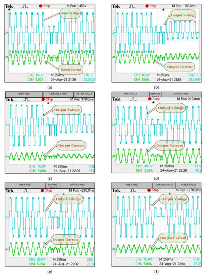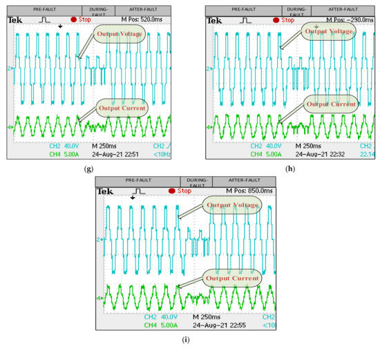 The output voltage and current waveforms during the fault condition, when the OC fault occurs at any switch, are shown in Figure 12. The output voltage and the output current are shown in Figure 12a when there is a fault in switch S1. The voltage and current have an 80V (rms) peak and a 10.2 A peak-to-peak value, respectively. Figure 12b shows the output waveforms (voltage and current) when there is a fault in switch S2. The output waveforms obtained are of three-level after a fault condition. Figure 12c shows the output waveforms when there is a fault in switch S3. The output waveforms obtained are of three-level. Figure 12d shows the output waveforms when there is a fault in switch S4. The output waveforms obtained are of five-level. Figure 12e shows the output waveforms when there is a fault in switch S5. The output waveforms obtained are of five-level. Figure 12f shows the output waveforms due to a fault in S6. The output waveforms obtained are of five-level. Figure 12g shows the output waveforms when there is a fault in switch S7. The output waveforms obtained are of five-level. Figure 12h shows the output waveforms when there is a fault in switch S8. Figure 12i shows the output waveforms when there is a fault in switch S9.