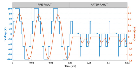 Pre-fault and post-fault output voltage and current waveform for PUC5.
