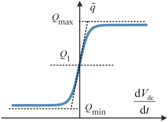 When the absolute value of the converter output voltage variation rate dVdc/dt is small, according to the saturation function characteristics, it can be seen from Equation (13) that the curve is approximately a straight line with a fixed slope of Q2. It can be seen that even if the voltage fluctuation is small, the slope of the droop characteristic can maintain a large fluctuation. Therefore, the proposed nonlinear virtual inertia method can also provide greater inertia for the system. When the absolute value of the converter output voltage variation rate dVdc/dt is large, due to the limitation of the saturation function, the value of will infinitely approach the upper limit Qmax and the lower limit Qmin of the droop coefficient variation range without crossing the boundary.