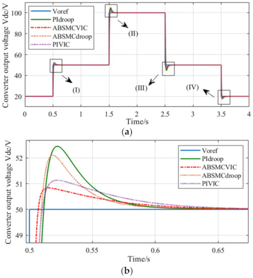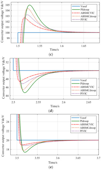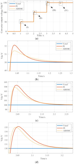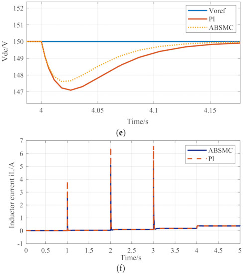 As shown in Figure 6, when the voltage reference value and load change, this scheme compares the response performance of cascaded PI and cascaded ABSMC. As shown in Figure 6a–e, the proposed cascaded ABSMC is compared with the traditional cascaded PI. In the 1–4 s period, while the response time is accelerated, the overshoot is reduced by about 1.5%, 0.8%, 0.4%, 0.8%, and there is no static error in the steady-state. When tracking the change of the voltage reference value, the proposed control method shows better transient and steady-state performance. Compared with the control method based on cascaded PI, the proposed control method based on cascaded ABSMC reflects lower overshoot, faster response speed, and shorter settling time under the effect of voltage tracking and load disturbance.