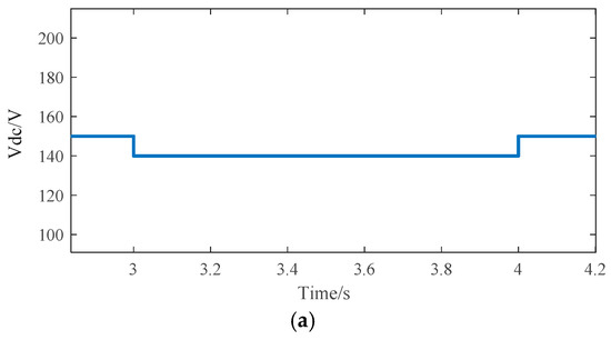 This scheme sets the voltage reference value Vo ref to change continuously and dynamically within a small range of 90~110 V and a large range of 50~150 V. Under the three-level cascade control conditions based on virtual inertia droop control and current and voltage adaptive backstepping sliding mode control, the response curve of the converter output voltage Vdc is shown in Figure 10.