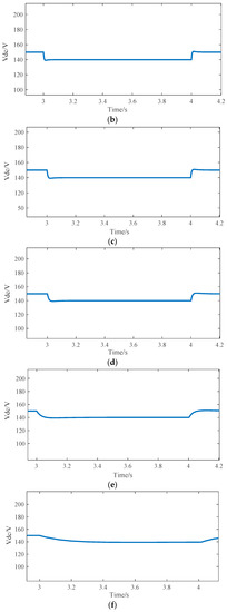 Figure 9 shows the output voltage of the converter when the above four different control methods respond to load changes. The performance parameters of four different control methods are shown in Table 5. It can be seen from Table 5 that the proposed three-level cascade control method with virtual inertia shows lower overshoot, shorter transition time and smaller IAE (Absolute error integration indicator) when responding to load changes and provides higher inertia for the output voltage of the converter.