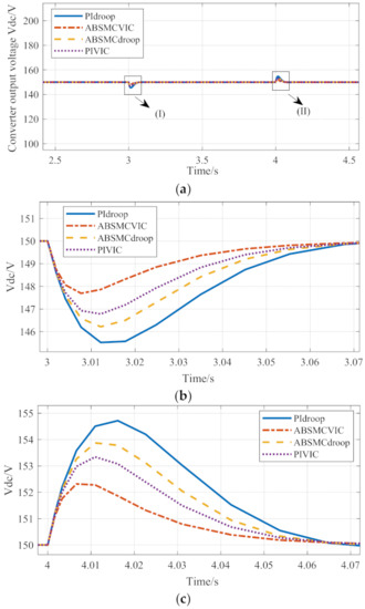 To verify the performance of the proposed three-level cascade control method, four different cascade control methods are designed for comparison: (i) Traditional droop control and current and voltage PI three-level cascade control (PIdroop); (ii) Virtual inertial droop control and current Voltage PI three-level cascade control (PIVIC); (iii) Traditional droop control and three-level cascade control of current and voltage ABSMC (ABSMCdroop); (iv) Virtual inertia droop control and current and voltage ABSMC three-level cascade control (ABSMCVIC).