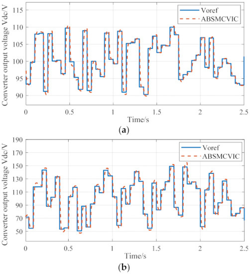 Figure 10a shows that the converter can track the voltage reference value accurately and achieve effective control of the output voltage when the DC bus voltage reference value Vo ref varies continuously and dynamically in a small range. Figure 10b shows that due to the capacitance of the capacitor, there is a slight delay in tracking the high-frequency voltage signal. But the trend of the response is consistent with the trend of the original signal of the voltage reference value, and finally tends to be stable.