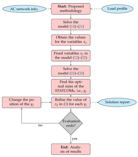 Even if the previous optimization methodologies are efficient to solve the problem addressed in this research, these have two main problems, which are (i) the usage of combinatorial methods to locate and size the STATCOMs since their random exploration and exploitative nature through the solution space makes it impossible to ensure the global optimum finding, and (ii) in the case of the exact MINLP approaches, the main complication is associated with the non-convexity of the solution space in their continuous component that highly increases the possibility of staying stuck in local optimal solutions. To deal with these problems, this research proposes a new methodology based on the hybridization of two convex-based models. The proposed methodology is completely described below.