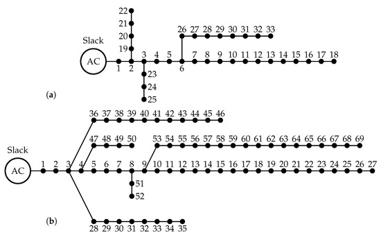 Distribution grids under study: (a) IEEE 33-bus system and (b) IEEE 69-bus system.