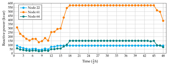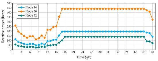 Daily reactive power injection in the selected nodes where the STATCOMs were installed in the IEEE 33-bus system.