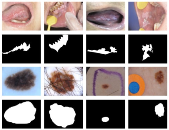 There are also some medical image datasets consisting of visible images, such as our oral leukoplakia dataset and the ISIC2018 [,,] used in this paper. Different from radiographic images such as CT and MRI images, this type of medical image taken by conventional visible light cameras have larger size, and relatively richer semantic information, while they also have challenges in terms of object segmentation. As shown in Figure 1, the same category of objects has some differences in visual features, while the features of different categories of objects have similarities. The texture, color, shape, and size of lesions in the images varies, and the boundary of lesions is blurred. In addition, all of the artifacts during image capturing, light intensity and reflections, bubbles, hair occlusion, background boards, and so forth, bring many difficulties to the segmentation task. Specifically, for the oral leukoplakia dataset built in this paper, the difficulties of leukoplakia lesion segmentation mainly lie in the morphology diversity of lesion, including granular, crumpled, warty, and so forth. In addition, the differences in the size of lesions, the blur boundaries between the lesions and their surrounding tissues, and the changeable locations of lesions, and so forth, will also increase the difficulty in the segmentation of leukoplakia. At present, there are few related works to oral lesion segmentation. Camalan et al. [] developed a image classification method to identify the “suspicious” oral dysplasia or “normal” oral images through transfer learning on Inception-ResNet-V2. Jubair et al. [] proposed a method to predict oral cancer from oral images using a lightweight transfer learning model. These methods are designed for the image classification task, while our method is performed for segmenting the oral lesion, which is the image segmentation task with more complexity. Figure 1 shows some examples of segmentation results of oral leukoplakia and skin disease lesions. All of these complex medical images pose big challenges for lesion segmentation, since the category filling rate loss in traditional image segmentation models often loses its effects of medical image segmentation.