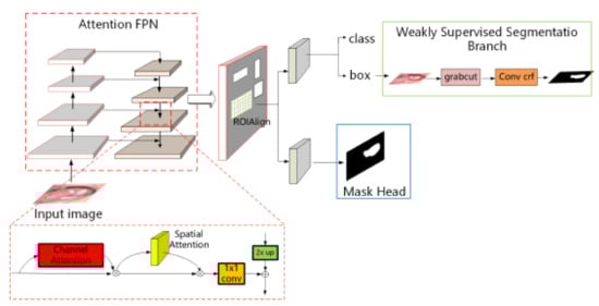 The outputs of ResNet C2, C3, C4, C5 calculate the one-dimensional channel attention on the channel axis through channel attention module and a two-dimensional spatial attention map is calculated on the spatial axis through the Spatial Attention module. Then, the final feature map is calculated through the series connection and the process is shown in Figure 3. The training of the fully supervised segmentation network is carried out using a dataset with pixel-level labels. The training process is the same as the original Mask R-CNN. The detection branch and the Mask Head branch will be trained at the same time; the inference phase will generate the final segmentation result in the Mask Head branch.