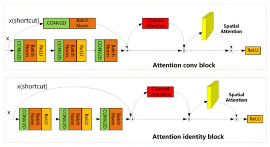FPN, as the backbone network of Mask R-CNN, performs well in conventional segmentation tasks. However, when segmenting medical images with complex and fuzzy boundaries, it often results in missing segmentation or wrong segmentation. The reason is that the correct features of the lesion area are not extracted. Therefore, we add the dual attention module in the backbone network and the improved attention-FPN structure is shown in the attention FPN part of Figure 2. As shown in Figure 3, the specific joining position of the dual attention module is in the Conv block and identity block of ResNet. Conv block and identity block are the basic modules of ResNet network. Conv block has convolution operation on branches, which can change the number of output channels of the block; Identity block has no operation on the branch, and the number of input and output channels of this block is the same. In our model, a dual attention mechanism is added to these two different blocks.