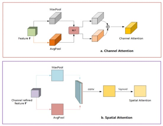 In order to calculate the channel attention, the spatial dimensions of the input feature are compressed, the global maximum pooling and global average pooling are performed respectively, and then the multilayer perceptron model (MLP) output features are added and operated through the shared MLP. As shown in Figure 4a, after sigmoid activation operation, the final channel attention map is generated. Multiply the channel attention map and the input feature to generate the input feature of the spatial attention module.