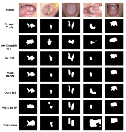 Oral leukoplakia is an injury to the oral mucosa and a precancerous lesion. We obtained the oral leukoplakia medical image dataset from the hospital which contains 90 original images and corresponding masks labeled by professional doctors. We divided the whole image dataset into a training set (55 images), a validation set (15 images), and a test set (20 images). Since the number of oral leukoplakia datasets is small, there is no test set. Compared with the ISIC 2018 dataset, the segmentation task of the oral leukoplakia dataset is more challenging. Not only is the number sparse—only 3% of the ISIC 2018 dataset—but also the boundary of the lesion area is more blurred, the shape is irregular and changeable. In the fully supervised segmentation experiment, the ground-truth labels are the binary masks of the original dataset. In the weakly supervised segmentation experiment, the ground-truth labels are the circumscribed rectangles of the binary masks.