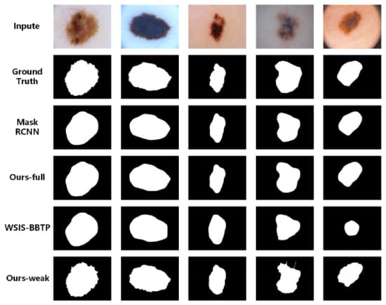 Figure 6 shows the segmentation results of the proposed fully supervised and weakly supervised methods on the ISIC 2018 [] dataset. It is not difficult to find out that some of the methods suffer a serious performance degradation on the oral leukoplakia dataset, but achieved much better performance on the ISIC 2018 dataset. The main reason may be that the lesion regions in the skin disease images are easier segmented than those in oral leukoplakia images. Therefore, there is little difference in the result images by the image segmentation methods. In addition, the weakly supervised segmentation methods also achieved good performance, and their results are almost close to the results obtained by the fully supervised segmentation methods. However, the results of our weakly supervised segmentation method have better shape consistency with the ground truths than WSIS-BBTP. Furthermore, the quantitative evaluation indicators of the experimental results are shown in Table 2. It can be seen that the proposed fully supervised segmentation method achieved great improvements over the original mask R-CNN, and also achieves competitive results compared with other methods. At the same time, our weakly supervised segmentation method has better performance than WSIS-BBTP, and also achieved comparable performance regarding fully supervised segmentation methods, and even surpassed some fully supervised segmentation methods, such as U-net [], Att U-net [], R2U-net [], Att R2U-Net [], BCDU-Net []. Furthermore, the experimental results on ISIC 2017 are shown in Table 3. It can be seen that there have been better performances for different models compared with ISIC 2018, and our weakly supervised segmentation method also achieved a competitive performance with other fully supervised segmentation models.