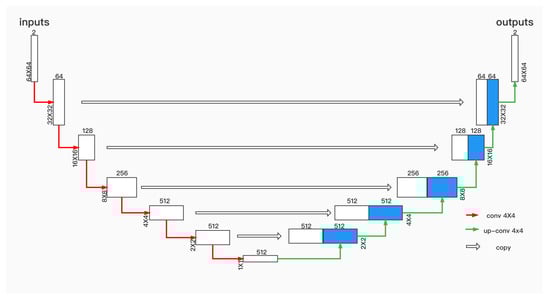 The loss function of the GAN is similar to traditional pix2pix. The loss function of cGAN with L1 distance is used for the generator, and the binary cross-entropy loss function is used for the discriminator. Additionally, the loss function of the cGAN and L1 distance can be expressed as the following Equations (12) and (13), respectively: