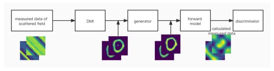 The GAN and DMI applied for nonlinear inverse scattering. When training and simulating, the measured data of the scattered field will be calculated by Equation (7).