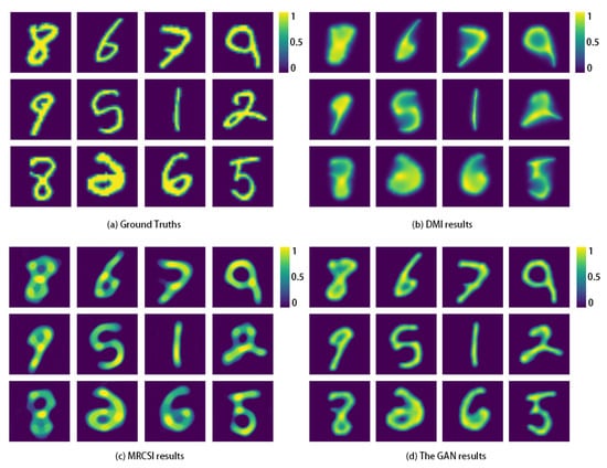 Example 1: Reconstructed images of the contrast distribution are calculated by different algorithms on MNIST. (a) Ground truths. (b) DMI result. (c) MR-CSI results of 500 iterations. (d) The GAN results, where the inputs are the DMI results.