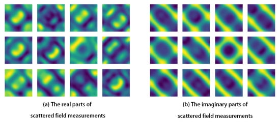 - First, the scattered field measurements can be calculated by Equation (7) with ground truths;