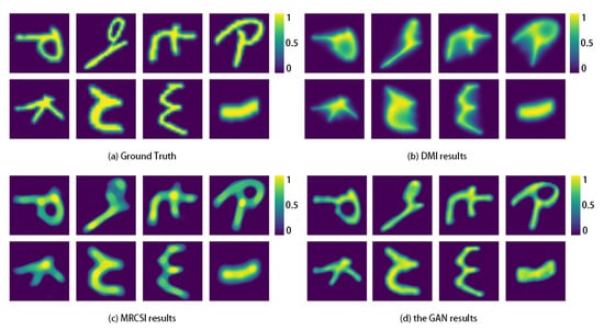 Example 2: Reconstructed images of the contrast distribution are calculated by different algorithms on EMNIST. (a) Ground truths. (b) DMI result. (c) MR-CSI results of 500 iterations. (d) The GAN results, where the inputs are the DMI results.