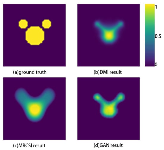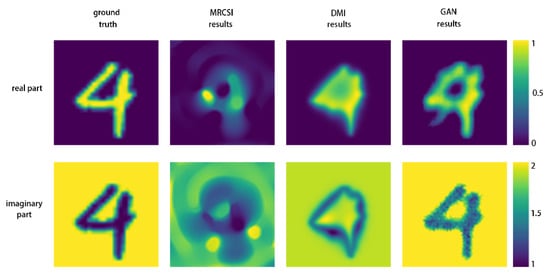 In this example, the real parts of the contrast are the ground truths in Figure 6 and the imaginary parts were also set to 0. Figure 6 shows the reconstruction results based on different methods. The SRE is used to evaluate the imaging effects of these three methods. Additionally, the results are shown in Table 4. Through the above experiments, it can be concluded that although the GAN is only trained by the MNIST dataset, excellent reconstruction results can still be obtained by using the trained model for objects with different characteristics. This shows that GAN has good generalization ability and can eliminate the calculation error introduced by DMI. Using DMI combined with the GAN is an excellent method to solve ISP.