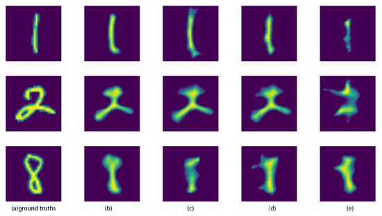 We also wanted to know whether the imaging ability of the GAN is better than other neural networks. We decided to compare the imaging results with CVP2P []. CVP2P is mainly used for the image which is composed of 0 and 1. Thus, we converted the ground truths from [0, 1] to 0 and 1. If the pixel value is greater than 0.5, we set its real parts to 1, and if the pixel value is less than 0.5, we set its real parts to 0. All the imaginary parts were set to 0. The ground truths were used for calculating the measurement data by the forward model. Additionally, the DMI method was used to estimate the initial images. The initial images are the inputs of the GAN. The imaging results of CVP2P and the GAN are shown in Figure 7. Additionally, the SRE results are shown in Table 5.