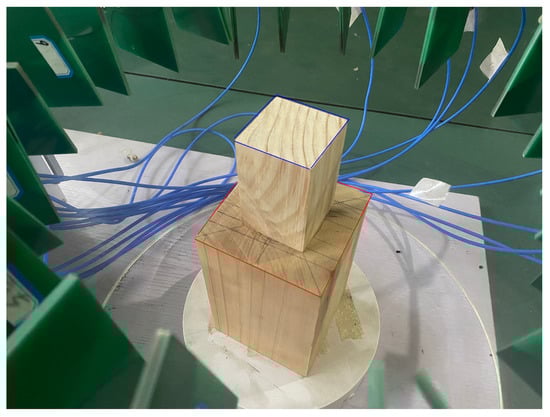 The whole experimental system can work at 3–5 GHz. A total of 24 balanced Vivaldi antennas were evenly distributed on a cylinder with a radius of m as electromagnetic wave-generating devices. Each Vivaldi antenna is 7 cm long and cm wide. The maximum imaging area is a square area with a side length of 7 cm. The model of the vector network analyzer is kc901v and connected to the antenna through an Agilent coaxial matrix switch to control the reception and transmission of electromagnetic waves. Additionally, the analyzer provides port isolation of greater than 100 dB over the frequency range of interest. The computer is connected to the vector network analyzer through a USB and automatically collects measured data through the Agilent coaxial matrix switch control device. The target is a square wooden block with a side length of 5 cm, and its contrast is 2. The same as the previous numerical simulation, the imaging area D is evenly divided into small cells. The target is shown in Figure 11.