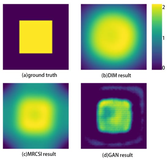 The training of the GAN was optimized by the ADAM optimization method []. The learning rate of the generator was set to , and the discriminators were set to . The filters were initialized randomly. All calculations were performed on a small server configured with 256 GB of memory with Intel(R) Xeon(R) CPU E5-2690 v4 and Tesla K80. The GAN and DMI were implemented by a tensorflow library []. Additionally, the MR-CSI algorithms were also implemented by the tensorflow and numpy library [,]. The DMI algorithm took about 4 s, and the MR-CSI algorithm, with 500 iterations, took about 5 min. The training time of the GAN was about 24 h and reconstructed process was about 5 s.The numerical simulation process is as follows: