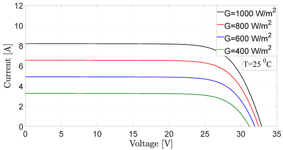 where is the photovoltaic current, is the diode saturation current, n is the diode ideality factor, is the module series resistance, is the module shunt resistance, is the number of cells in one module, is the terminal current, and is the output voltage. Furthermore, the characteristics of the PV source at different atmospheric conditions are given in Figure 1 and Figure 2 [10].