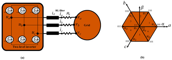(a) Two-level voltage source inverter with grid connection. (b) Switching states and voltage vectors of the inverter.