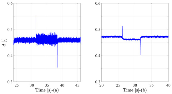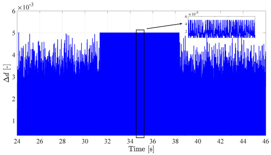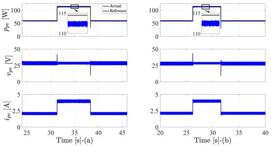 Figure 11 shows the adaptive steps variation of the predictive method, where the first step () and the second step () are investigated. At the first interval, the current step-size variation is very small. This also applies to the corresponding duty cycle at the same interval. When a step-up change in the power occurs, the step-size of the current and duty cycle is saturated according to the predefined limits (0.05 and 0.005). At the second interval, the step-size variation of the current is a little bit higher in comparison to the first interval. However, the duty cycle variation remains approximately unchanged, thanks to the dual step-size design of the proposed method. Finally, when a step-down change (to the previous power level) in the power happens, the saturation limits are activated again, and the system goes into a steady state, similar to the first interval.