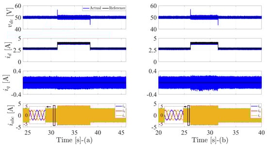 Figure 13 presents the response of the inverter control with the conventional FS-MPC and the proposed efficient one, where the results show the DC-link voltage (), the d-axis current (), the q-axis current (), and the injected three-phase currents (). The DC-link voltage exhibits over and undershoots in conjunction with the step changes of the PV power. However, the system returns quickly to the steady-state condition. As a consequence of the PV power change at the PV side, the d-axis current responds to that change to inject the excess power into the load. The q-axis current is maintained at its reference value (=0 for the unity power factor operation at grid-connected situation). Furthermore, the injected currents are sinusoidal.