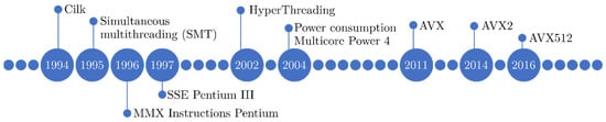 Consumer CPU architectures have traditionally powered their performance by increasing the frequency clock as well as including parallel capabilities since the 1990s. In the Intel x86 family, the Single Instruction Multiple Data (SIMD) introduction was coined MultiMedia eXtensions (MMX) in 1996 for the release of the Intel Pentium MMX processor []. They were composed of eight 64-bit wide registers for integer data with an instruction set of 57 operations. They were focused on the early multimedia needs, mainly in the video game industry and imagery from the Internet irruption. They could execute one instruction in 64-bit integer data (such as 8 independent bytes or 2 32-bits words) simultaneously, saving loop iterations in integer data processing (such as images) [].